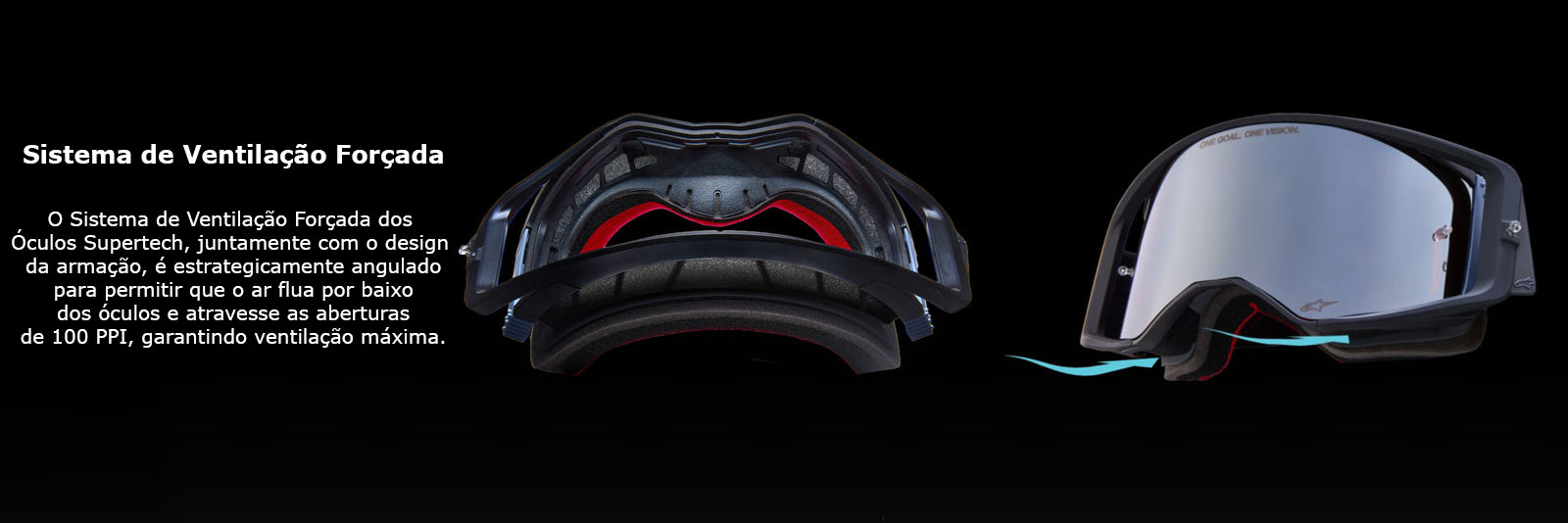 Óculos para motocross Alpinestars Supertech Corp conta com um sistema de ventilação estrategicamente posicionado para maximizar o fluxo de ar e evitar o embaçamento das lentes, sem comprometer a vedação contra poeira e sujeiras indesejadas.
