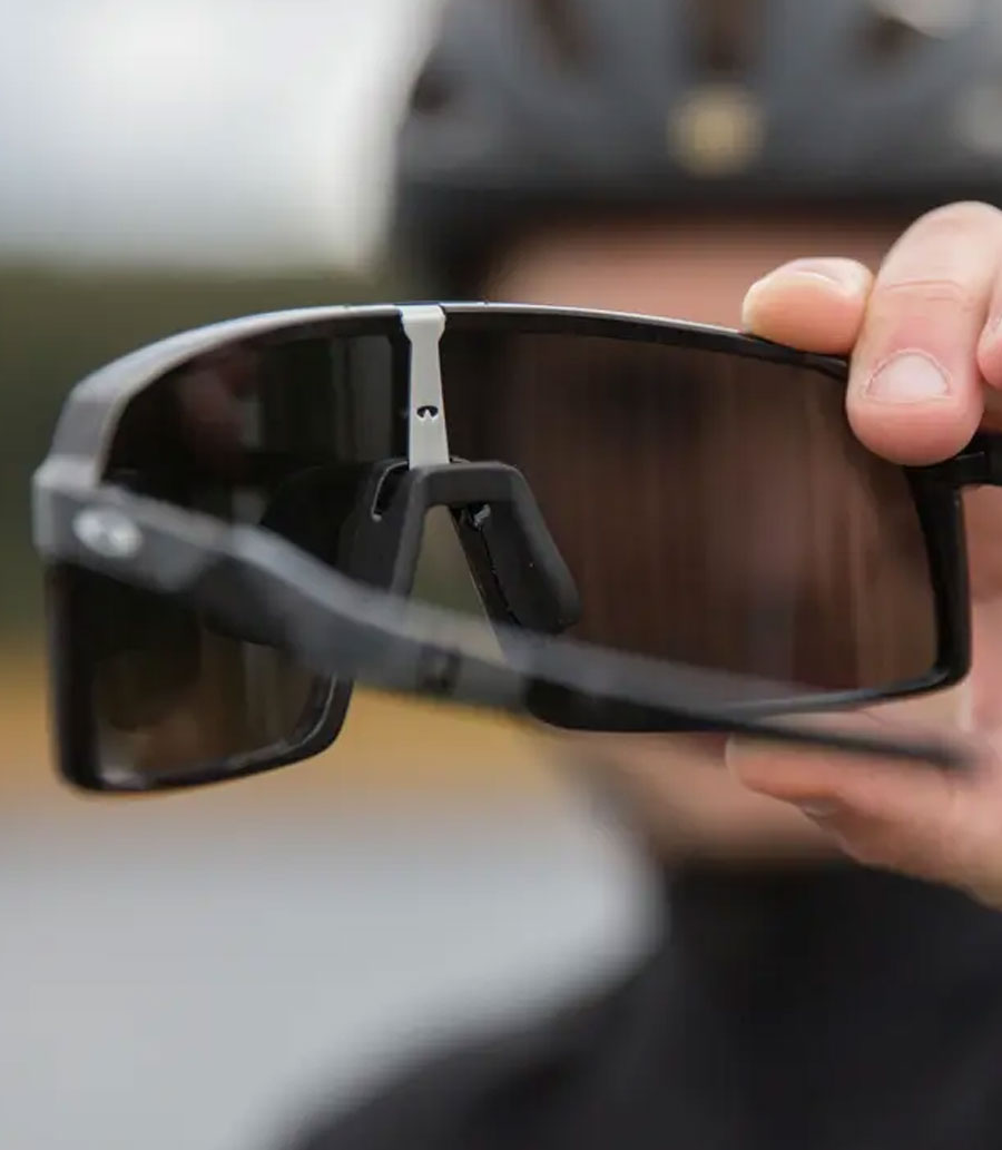 Óculos Oakley Sutro possui construção da ponta das hastes e nosepads (narizeiras) com tecnologia Unobtainium®- muito mais macia e aderente junto ao nariz e parte posterior da cabeça, mesmo com uso por cima das cintas jugulares do capacete de ciclismo, mantendo a segurança nas trepidações mais elevadas e sob altas condições de umidade.