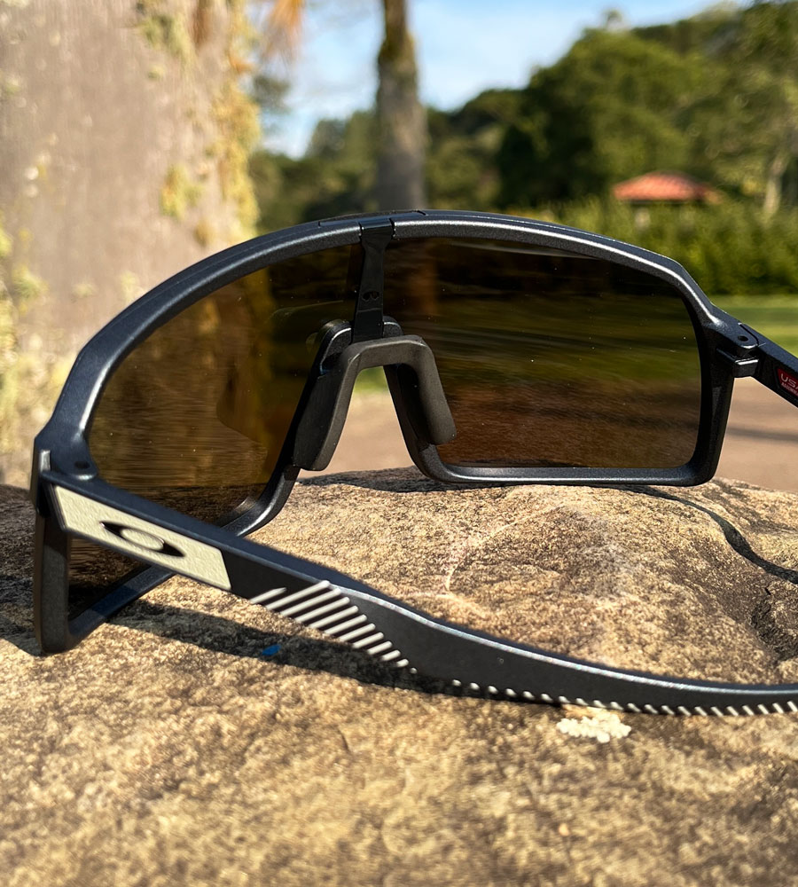 Óculos Oakley Sutro possui construção da ponta das hastes e nosepads (narizeiras) com tecnologia Unobtainium®- muito mais macia e aderente junto ao nariz e parte posterior da cabeça, mesmo com uso por cima das cintas jugulares do capacete de ciclismo, mantendo a segurança nas trepidações mais elevadas e sob altas condições de umidade.