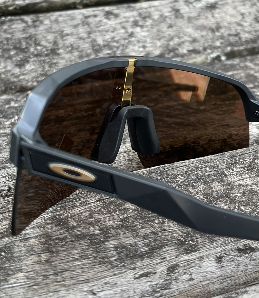 Óculos Oakley Sutro possui construção da ponta das hastes e nosepads (narizeiras) com tecnologia Unobtainium®- muito mais macia e aderente junto ao nariz e parte posterior da cabeça, mesmo com uso por cima das cintas jugulares do capacete de ciclismo, mantendo a segurança nas trepidações mais elevadas e sob altas condições de umidade.