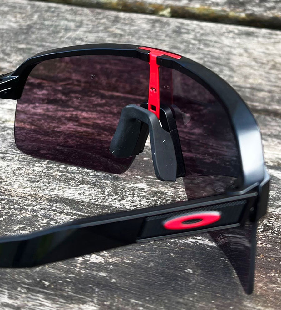 Óculos Oakley Sutro possui construção da ponta das hastes e nosepads (narizeiras) com tecnologia Unobtainium®- muito mais macia e aderente junto ao nariz e parte posterior da cabeça, mesmo com uso por cima das cintas jugulares do capacete de ciclismo, mantendo a segurança nas trepidações mais elevadas e sob altas condições de umidade.