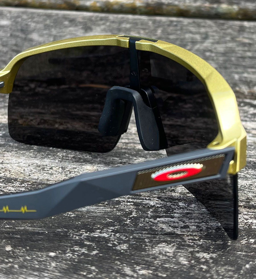 Óculos Oakley Sutro Lite possui construção da ponta das hastes e nosepads (narizeiras) com tecnologia Unobtainium®- muito mais macia e aderente junto ao nariz e parte posterior da cabeça, mesmo com uso por cima das cintas jugulares do capacete de ciclismo, mantendo a segurança nas trepidações mais elevadas e sob altas condições de umidade.