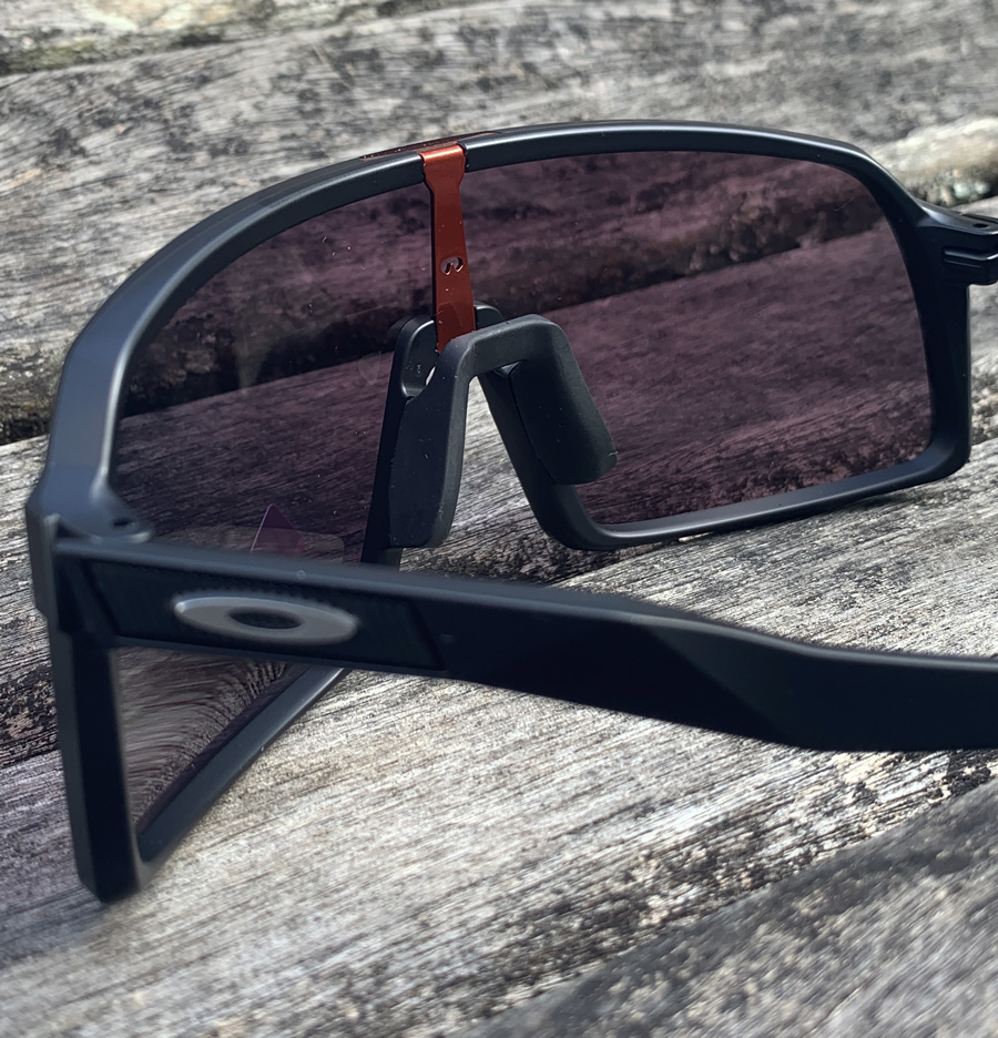 Óculos Oakley Sutro possui construção da ponta das hastes e nosepads (narizeiras) com tecnologia Unobtainium®- muito mais macia e aderente junto ao nariz e parte posterior da cabeça, mesmo com uso por cima das cintas jugulares do capacete de ciclismo, mantendo a segurança nas trepidações mais elevadas e sob altas condições de umidade.