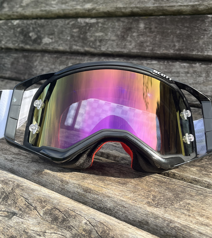 • 01 Óculos Scott Prospect Racing Black/White (Preto/Branco) com lente espelhada Purple (roxo) Chrome Works® já instalada