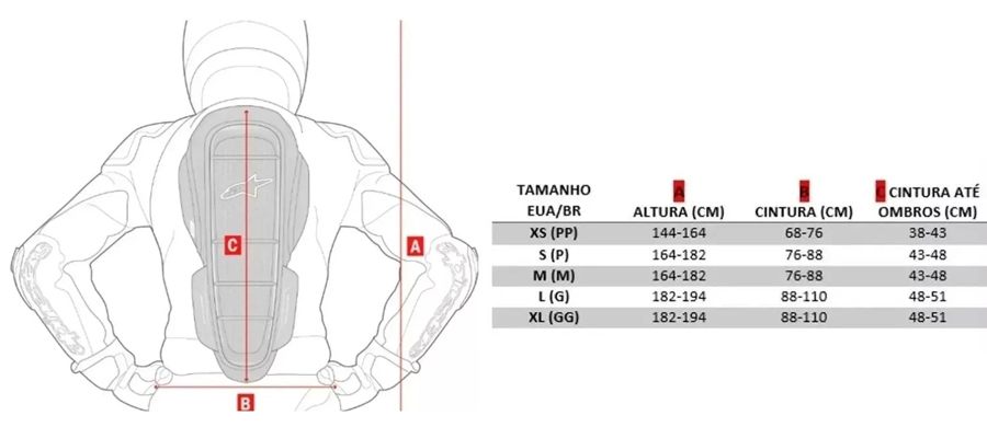 Confira as medidas do Protetor de Coluna Alpinestars Nucleon KR-1 Celli: