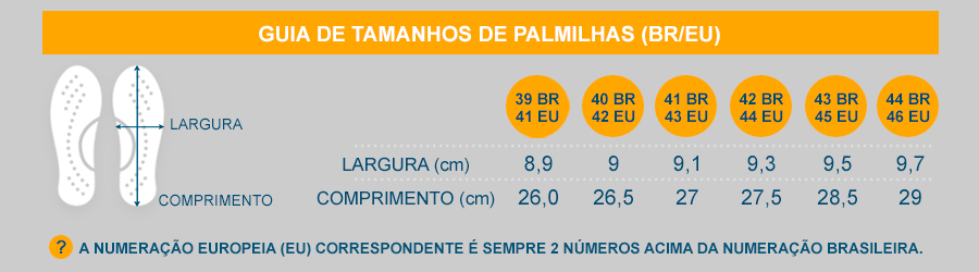 *Em nosso site as numerações já estão convertidas para o padrão Brasil, por isso, não se preocupe ao ver na caixa ou na palmilha uma numeração diferente, já que as sapatilhas são importadas e possuem a numeração padrão Europa (EU) dois números a mais que o padrão do Brasil.