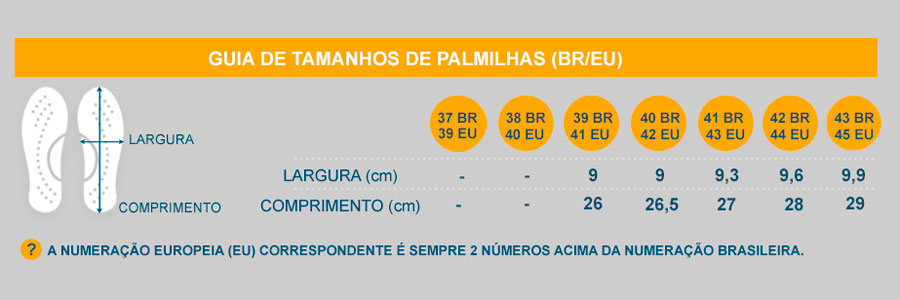 *Em nosso site as numerações já estão convertidas para o padrão Brasil, por isso, não se preocupe ao ver na caixa ou na palmilha uma numeração diferente, já que as sapatilhas são importadas e possuem a numeração padrão Europa (EU) dois números a mais que o padrão Brasil.