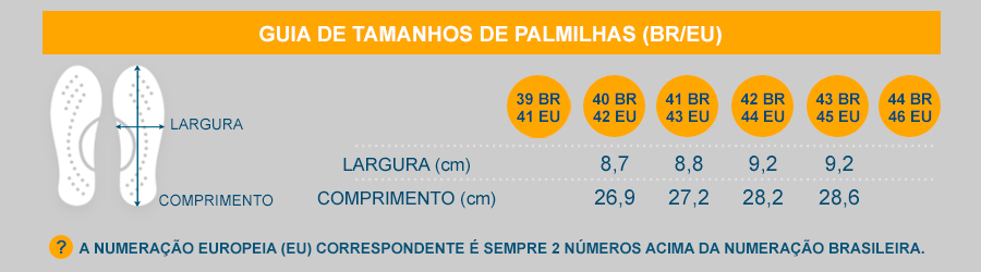 *Em nosso site as numerações já estão convertidas para o padrão Brasil, por isso, não se preocupe ao ver na caixa ou na palmilha uma numeração diferente, já que as sapatilhas são importadas e possuem a numeração padrão Europa (EU) dois números a mais que o padrão do Brasil.