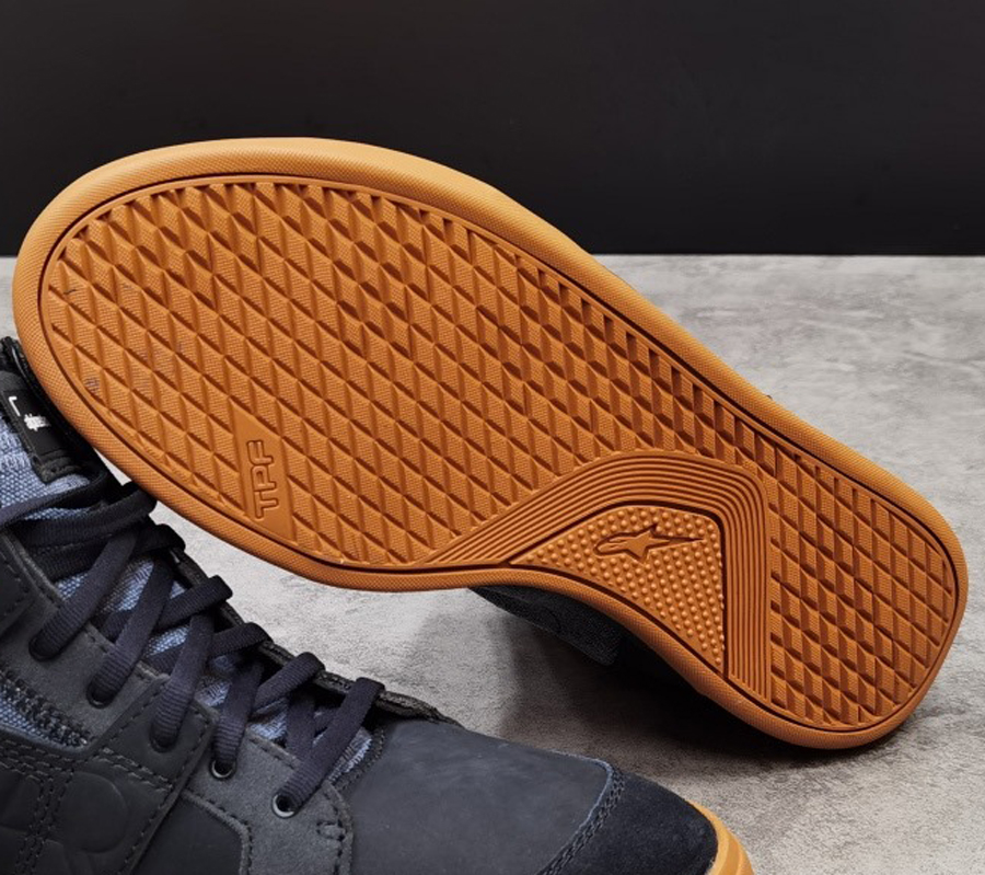 A sola Tênis Alpinestars Grange Riding, possui configuração de trava assimétrica, que auxilia a manter a aderência e a tração em diferentes tipos de superfícies.